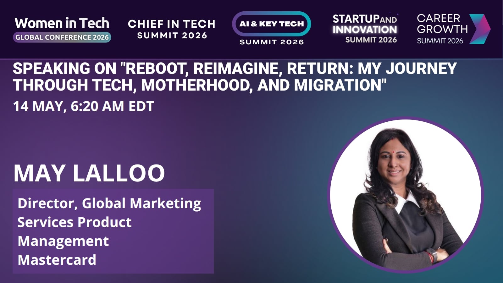 May Lalloo is a dynamic tech leader whose career spans design, marketing, and product management. With a passion for storytelling and strategy, she has led cross-functional teams and driven innovation across global markets. Her journey — shaped by motherhood and migration — reflects a deep commitment to resilience, reinvention, and inclusive leadership. Currently serving as Director, Global marketing services, product management, May brings a unique blend of creativity, empathy, and commercial acumen to everything she does.