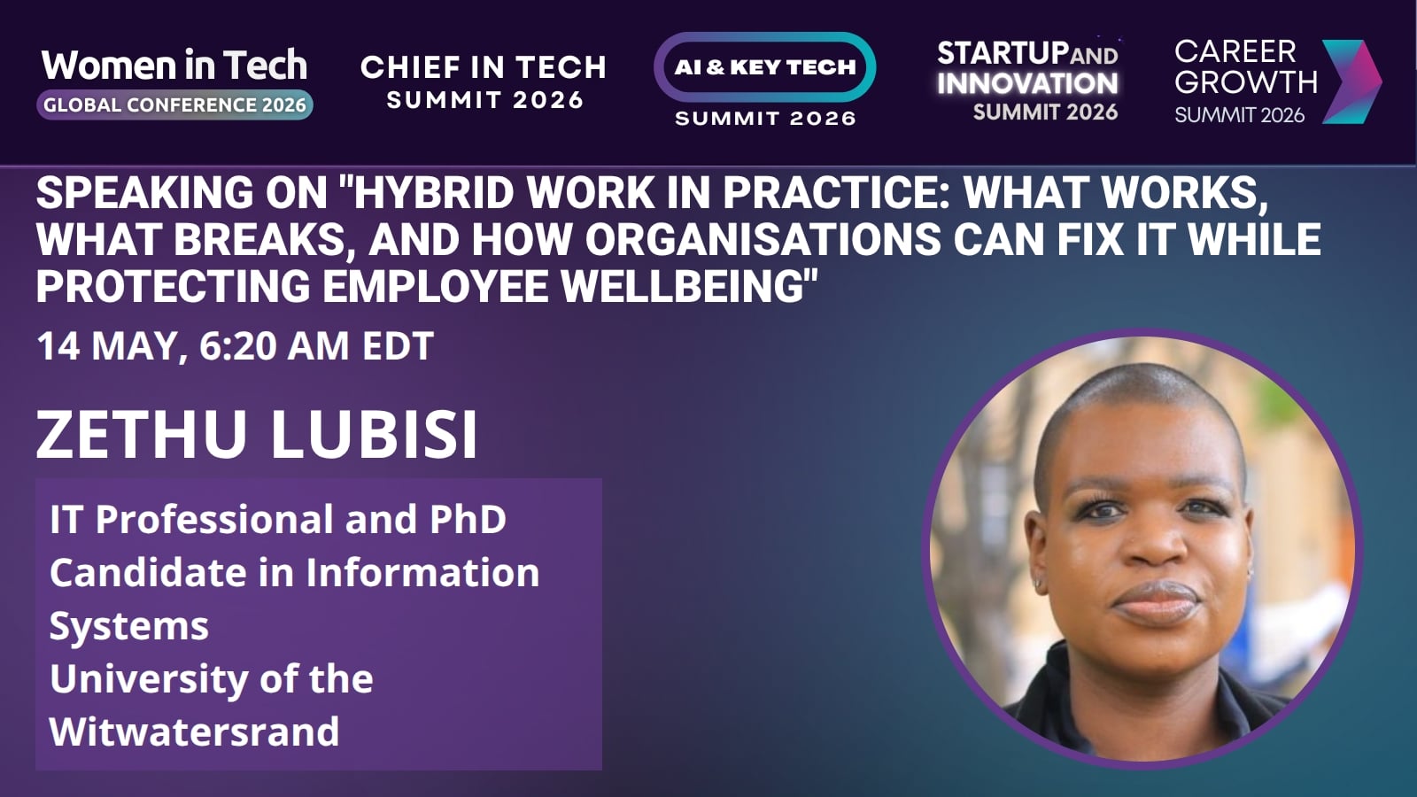 Zethu Lubisi is an ICT professional and doctoral researcher whose work focuses on hybrid working models, digital competence, and employee wellbeing within the ICT and telecommunications sector in South Africa. Her research explores how hybrid work shapes identity, performance, and wellbeing, with a particular focus on creating inclusive and sustainable work environments. She brings a practical, evidence-based perspective to conversations on the future of work, bridging research insights with real organisational challenges.